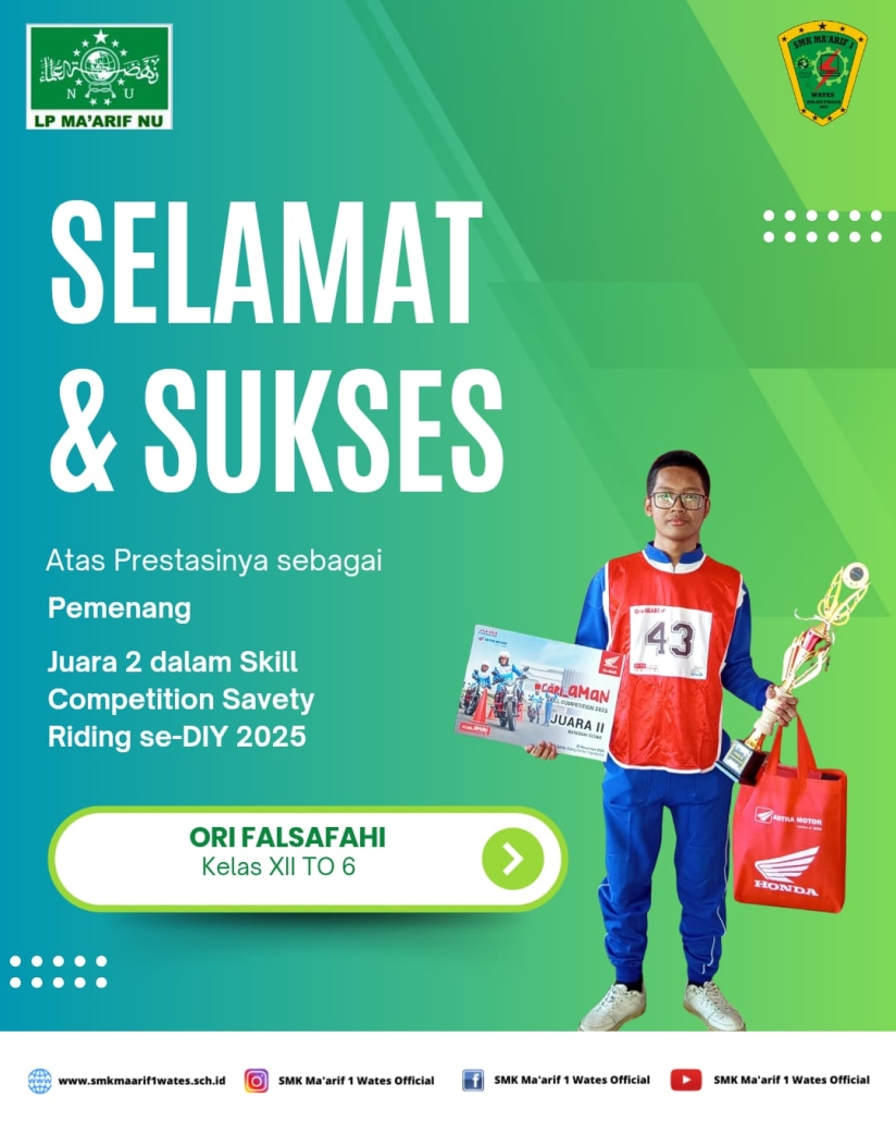 SMK Ma’arif 1 Wates kembali mencatatkan prestasi membanggakan di tingkat Daerah Istimewa Yogyakarta. Salah satu siswa berbakat dari Kompetensi Keahlian Teknik Otomotif (TO), Ori Falsafahi, berhasil meraih Juara 2 dalam ajang Skill Competition Safety Riding se-DIY 2025.